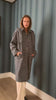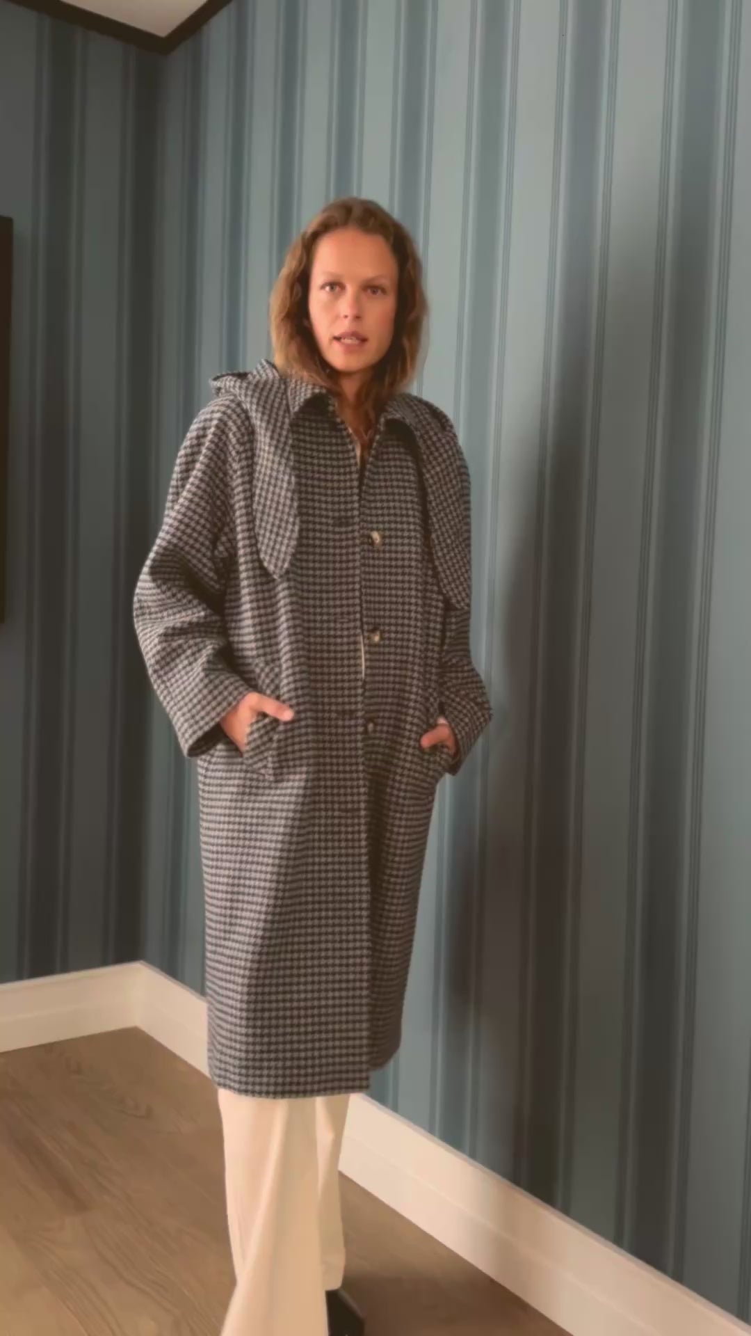 Abrigo largo oversize, lleva capucha con el tejido doble y se abrocha con un botón en la espalda y una lazada o nudo delante, de forma que si quieres puedes poner y quitar la capucha. Tiene cuello y va abotonado con botones de pasta marrones y beige. Lleva dos bolsillos en los lados. El tejido es una pata de gallo en tonos azules, es abrigado ya que es 100% lana merino, va forrado en el cuerpo y las mangas , es un abrigo muy cómodo, fácil y favorecedor que no querrás quitarte.