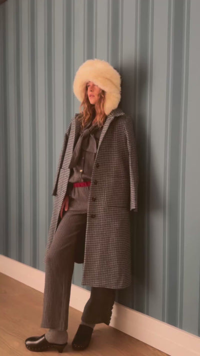 Abrigo largo realizado en lana 100% con un tejido de pata de gallo en tonos azules. Abotonado al cuello y abierto frontalmente con botones de resina negros. Es de corte recto, queda encajado de hombros y tiene dos bolsillos frontales. Va completamente forrado.