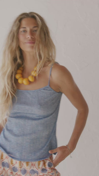 Bermuda confeccionada en tejido ligero de verano, con estampado de inspiración marina. El print combina motivos gráficos de conchas, estrellas y caballitos de mar, dispuestos en un patrón repetitivo y equilibrado. La paleta cromática se compone de azules, mostaza y rojo, sobre fondo claro, generando un contraste limpio y definido.