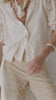 Blusa ligera de algodón, con escote en pico y cierre frontal con botones. Destaca por los detalles de encaje en las mangas, que aportan textura y un punto delicado sin recargar la prenda. La manga es corta con ligero volumen y acabado fruncido.