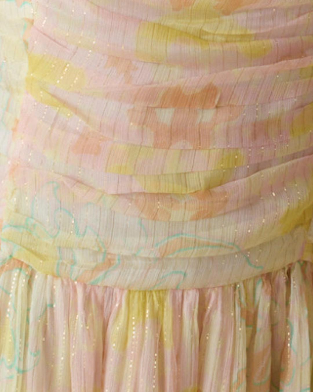 El print en tonos suaves amarillos, verdes y rosados aporta mucha luz y hacen que sea super favorecedora. La manga es corta y suelta.