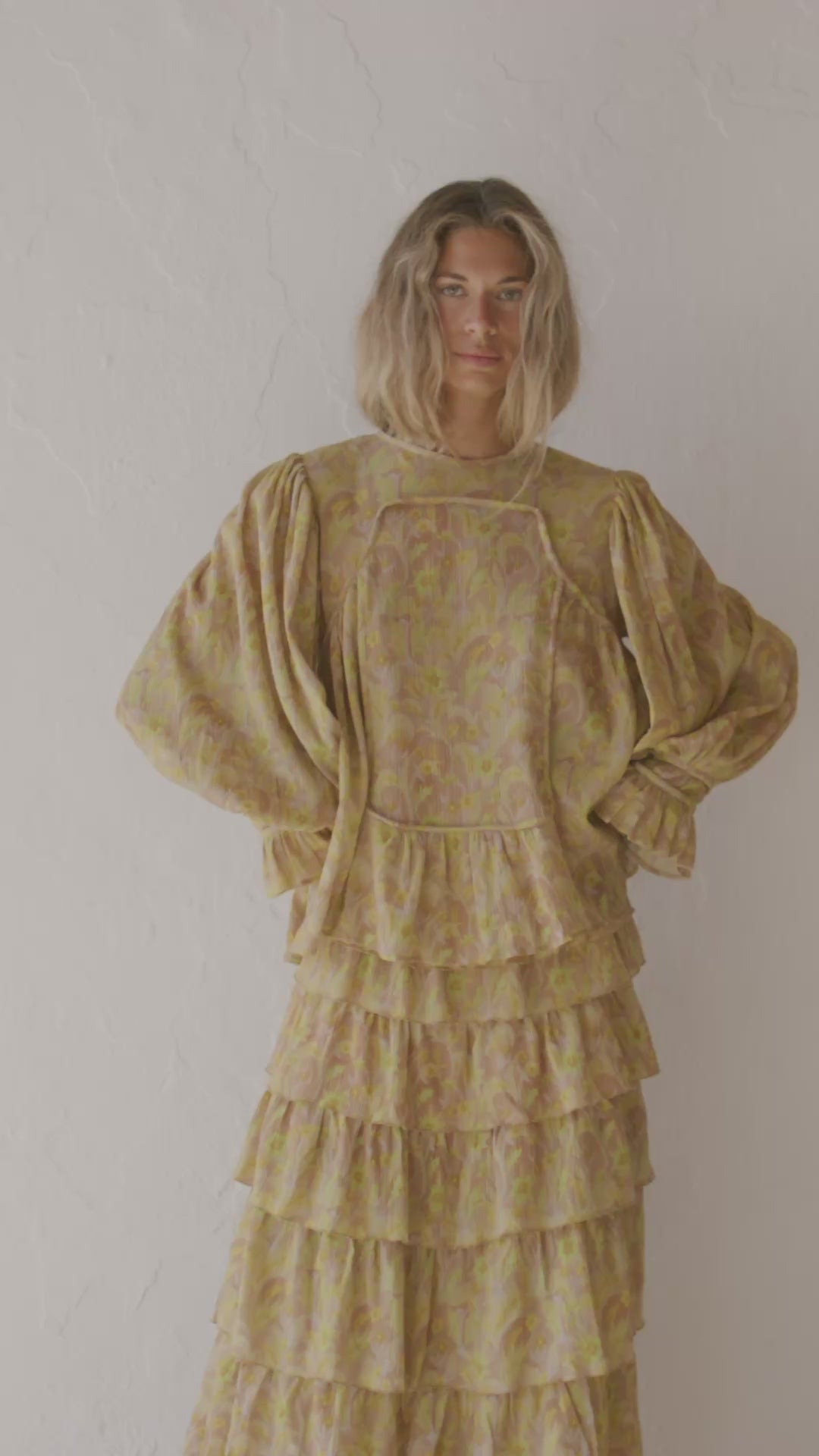 Camisa de silueta amplia y romántica, confeccionada en un tejido ligero y vaporoso que acompaña el movimiento con naturalidad. Su paleta cromática, inspirada en el paisaje balear, combina verdes oliva, ocres dorados y matices arena, evocando los campos secos al sol, la vegetación mediterránea y la luz cálida de las islas al atardecer.
