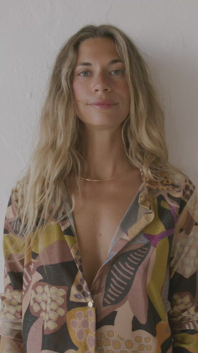 Camisa de corte relajado confeccionada en un tejido fluido y ligero, protagonizada por un estampado orgánico de inspiración vegetal con formas abstractas que evocan hojas, semillas y elementos naturales. La combinación de tonos tierras, mostaza, oliva y acentos malva aportan personalidad.