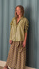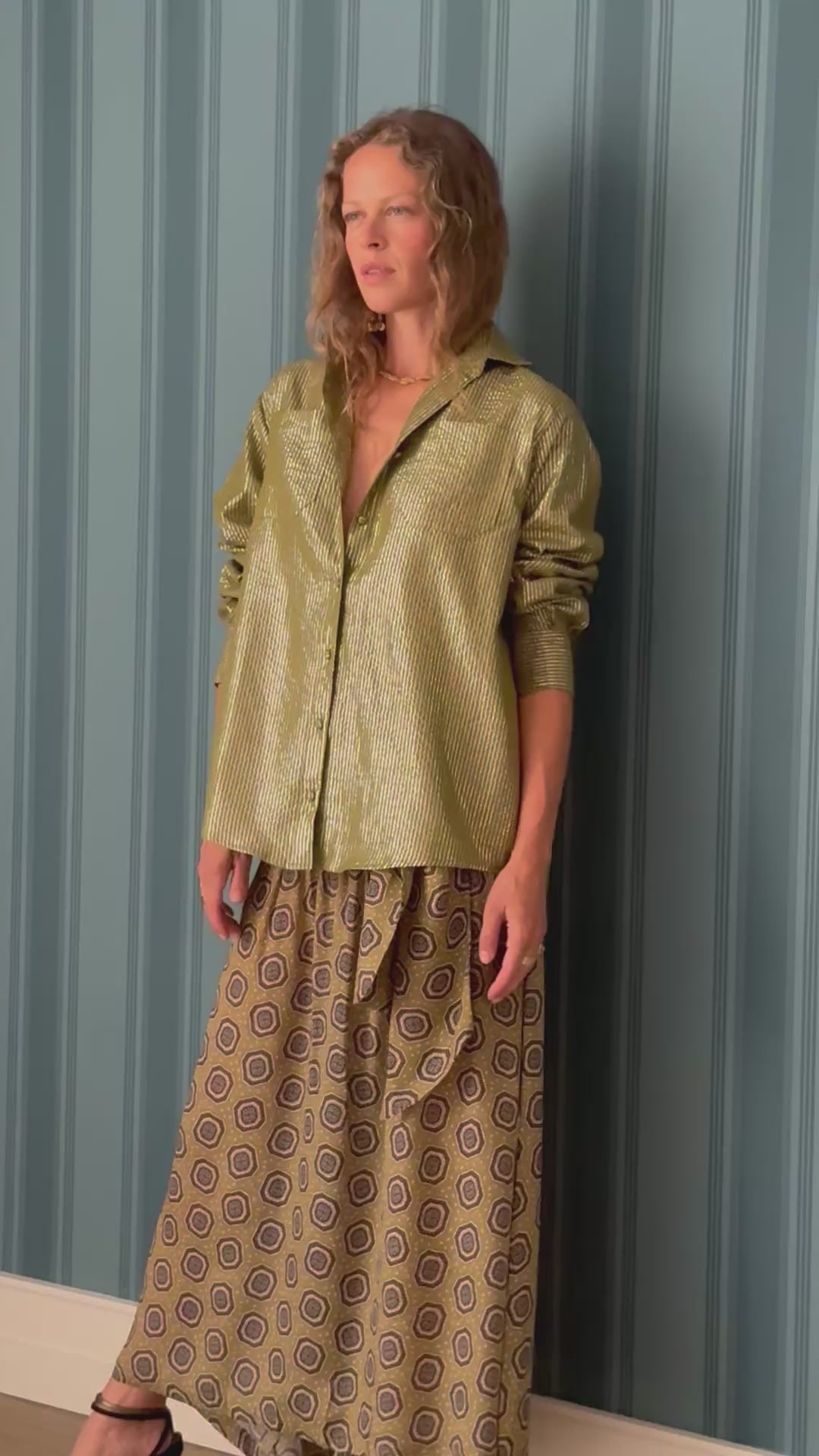 Camisa de manga larga realizada en algodón e hilaturas metalizadas de color verde ciruela y plateado. Es de corte masculino recto, tiene dos bolsillos en el delantero y abertura frontal con botones forrados. La manga es recta y termina en un puño con botón forrado.