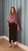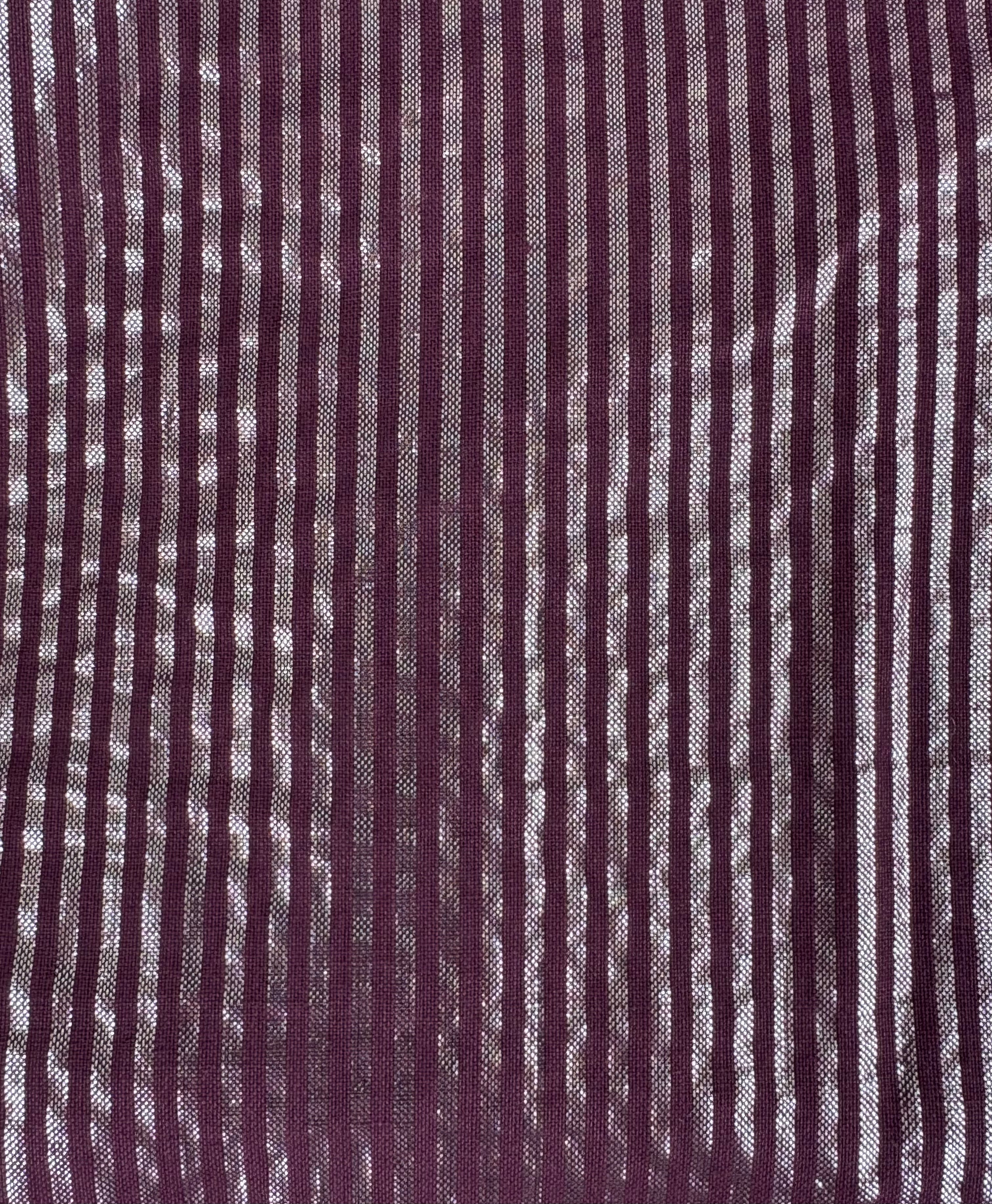 Camisa de manga larga fruncida realizada en algodón con hilaturas metalizadas en color berenjena y plata. Abertura frontal con botones forrados y mini-jaretas con un pequeño volante. Es de corte relajado, muy cómoda y favorecedora.