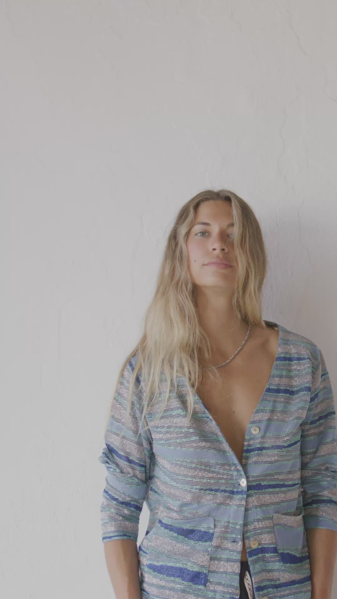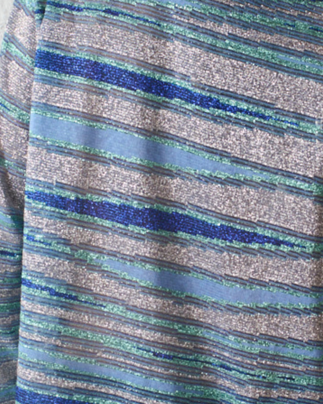 Chaqueta de silueta recta, con estampado horizontal irregular compuesto por bandas orgánicas de diferente grosor, que alternan zonas lisas y zonas con acabado luminoso. Combina azul medio como base con azules verdosos, verdes suaves, tonos grisáceos y trazos plateados de acabado metálico.