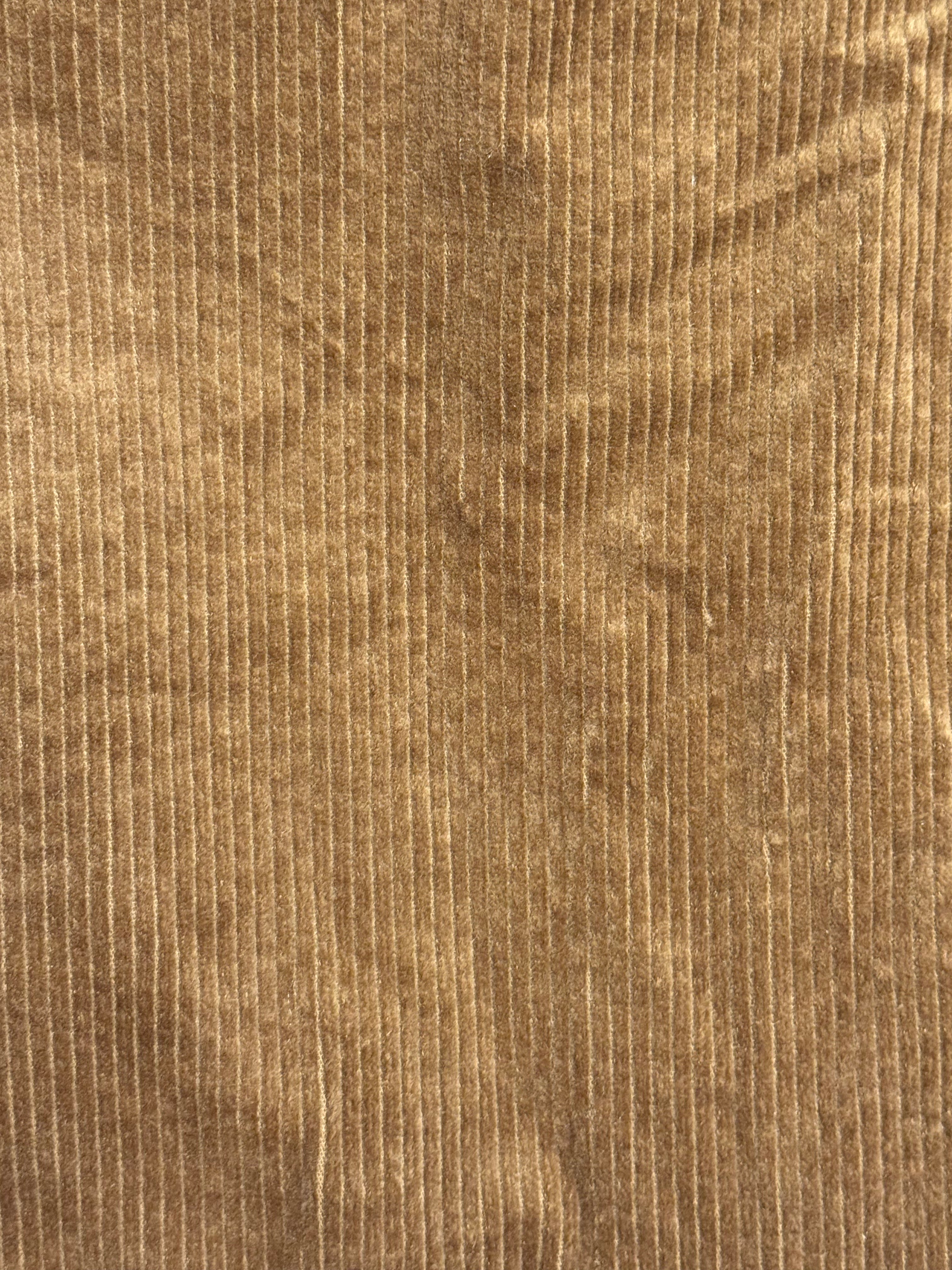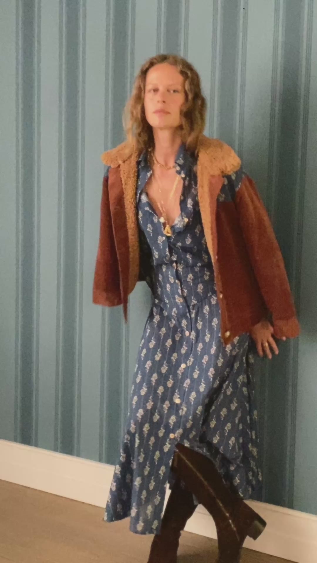 Chaqueta acolchada de pana color marrón con cuello. Abertura frontal con botones y bolsillos laterales. Detalle de canesú en estampado de algodón de flores en delantero y espalda . Está completamente forrada de borreguito sintético incluido el cuello. Es muy agradable, abrigada, no pesa nada y es perfecta para clima templado o frío.