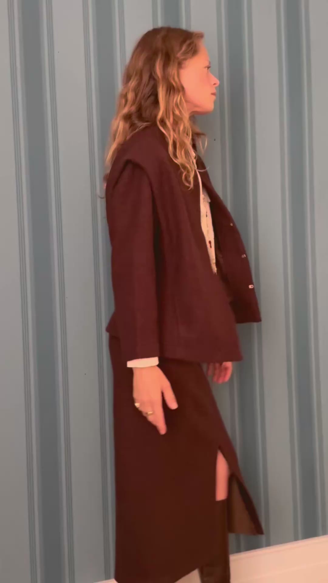 Chaqueta realizada 100% con lana cocida en un bonito color marrón. Va forrada completamente y es muy ligera. Es de corte cuadrado, lleva bolsillos laterales y se cierra frontalmente con unos clips dorados. Tiene un bonito cuello estilo Perkins y unos alerones en el hombro muy favorecedores.
