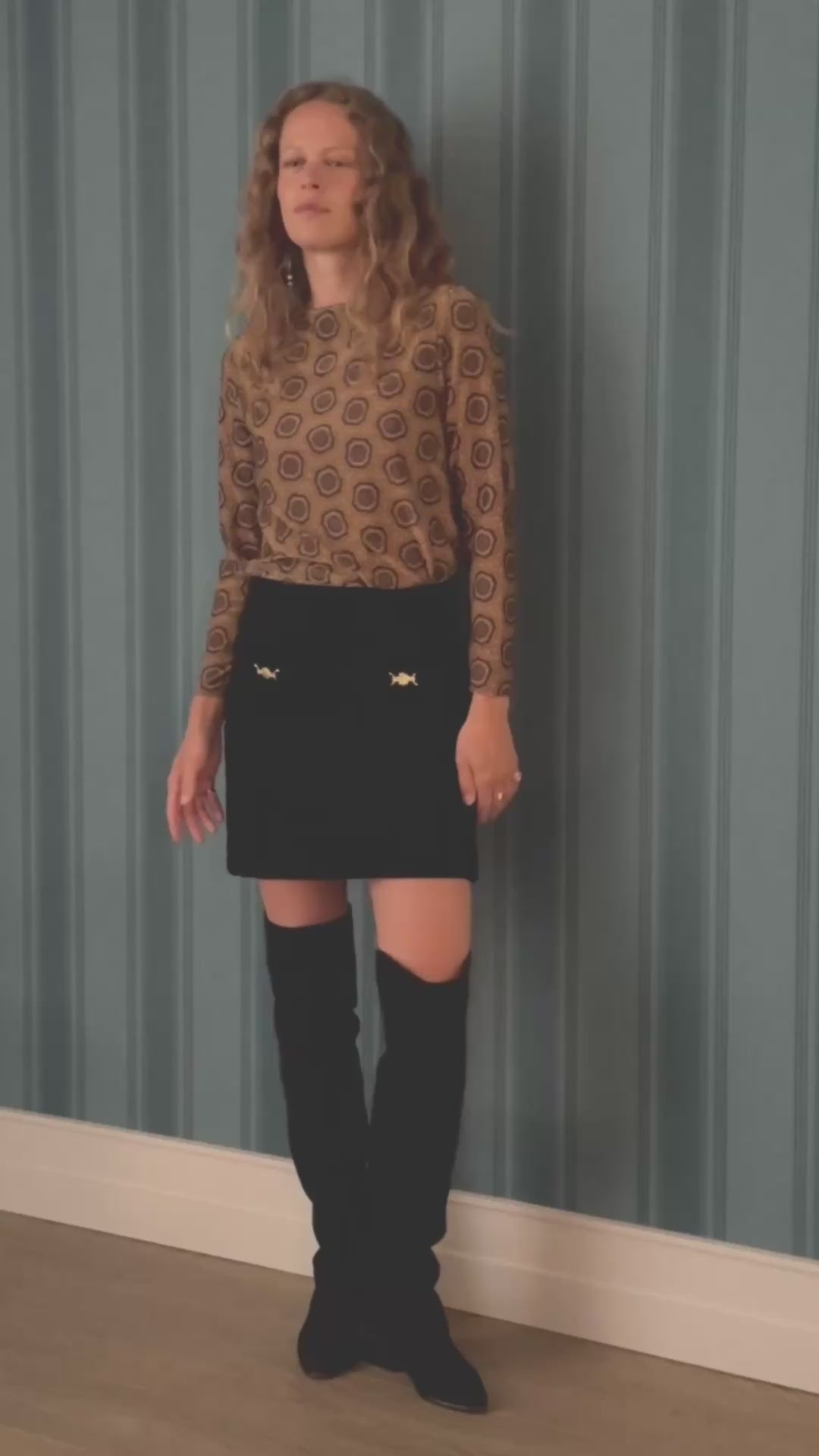 Con cierre de cremallera invisible es de corte recto entallado con pinza y tiene dos pequeños bolsillos superpuestos rematados con unas maravillosas hebillas doradas con forma de flor.