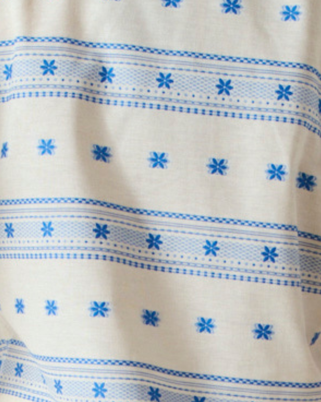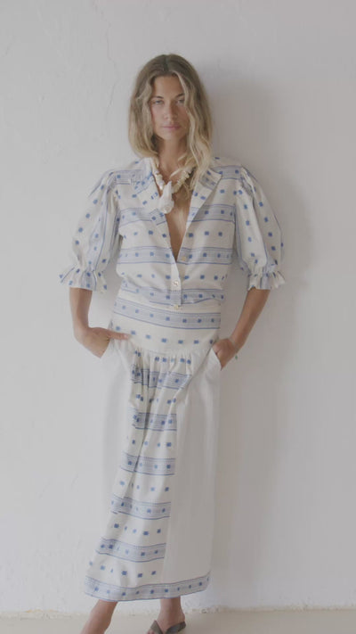Falda midi de línea evasé, confeccionada en un tejido ligero de base blanca con estampación geométrica en azul de florecitas distribuida en bandas horizontales. El patrón combina pequeños motivos regulares con líneas más marcadas.