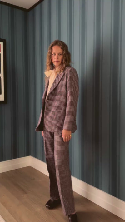 Pantalón largo de corte recto masculino realizado 100% en lana Merino en diseño de pata de gallo en tonos berenjena. Abertura frontal con cremallera y botón y cintura con trabillas para cinturón. El corte con pinzas es muy cómodo y favorecedor.