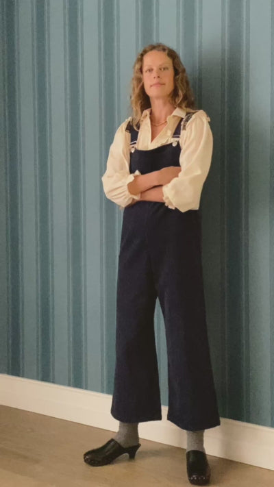 Peto largo de pana de algodón color azul. Es de corte relajado, con tirantes regulables con hebillas metálicas plateadas, bolsillos laterales y bolsillo frontal.Es suave, cálido y muy cómodo.