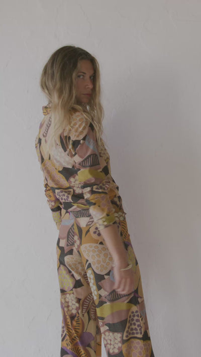 Polo de estampado gráfico de inspiración orgánica. El print combina formas abstractas y motivos geométricos. La paleta cromática se construye a partir de tonos tierra, mostaza, marrón, malva y negro, con acentos más claros que aportan contraste y ritmo al conjunto.