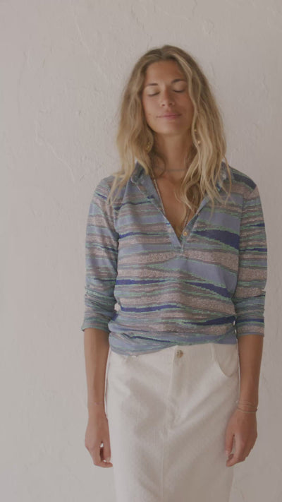 Polo de silueta recta, con estampado horizontal irregular compuesto por bandas orgánicas de diferente grosor, que alternan zonas lisas y zonas con acabado luminoso. Combina azul medio como base con azules verdosos, verdes suaves, tonos grisáceos y trazos plateados de acabado metálico.