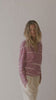Polo de silueta recta, con estampado horizontal irregular compuesto por bandas orgánicas de diferente grosor, que alternan zonas lisas y zonas con acabado luminoso. El diseño combina una base en crudo suave con tonos rosa fucsia, malva y acentos dorados.