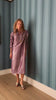 Vestido de corte camisero de manga larga fruncida, realizado en algodón con hilaturas metalizadas en color berenjena y plata. Abertura frontal con botones forrados y mini-jaretas con un pequeño volante. Es de corte relajado, muy cómodo y favorecedor.